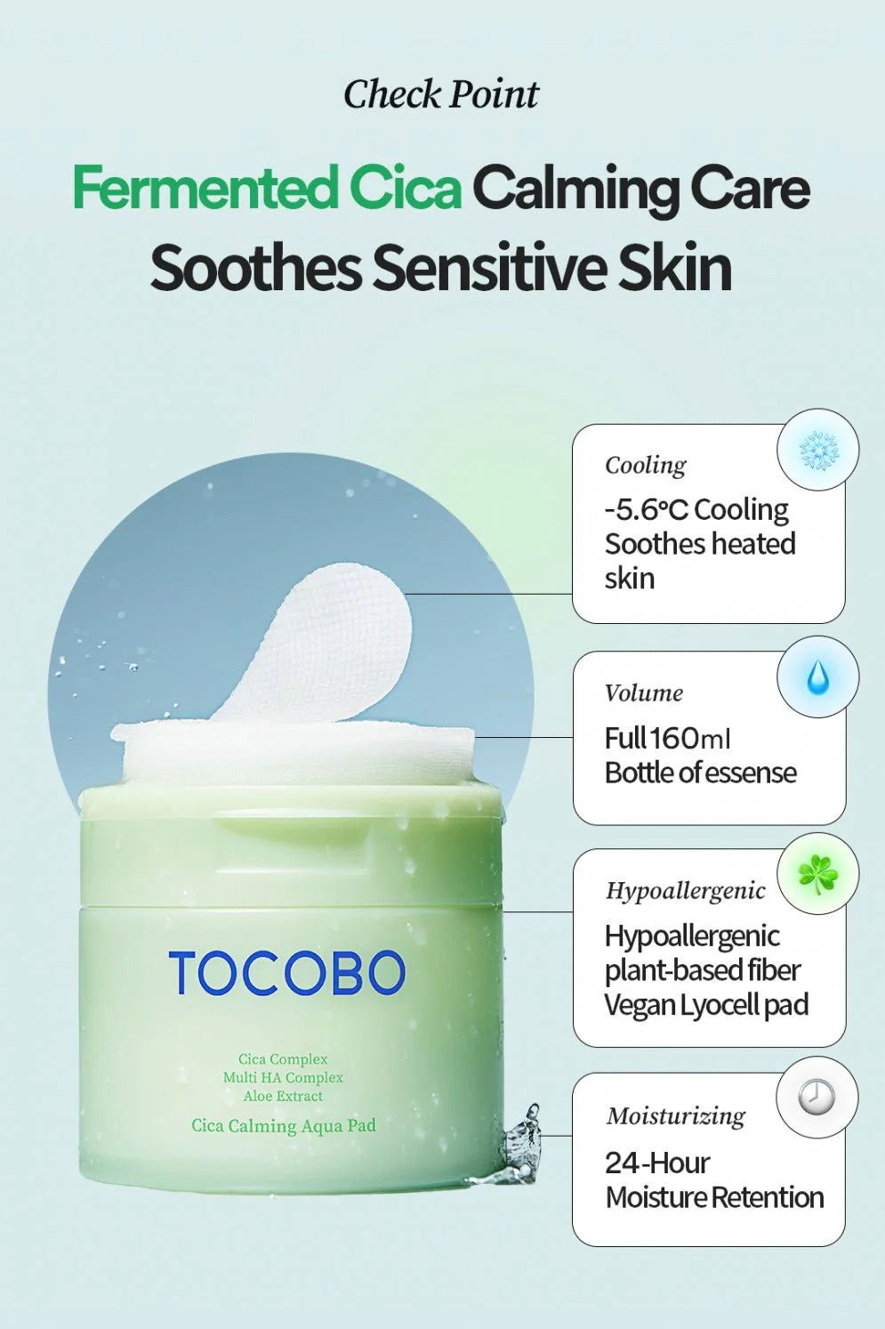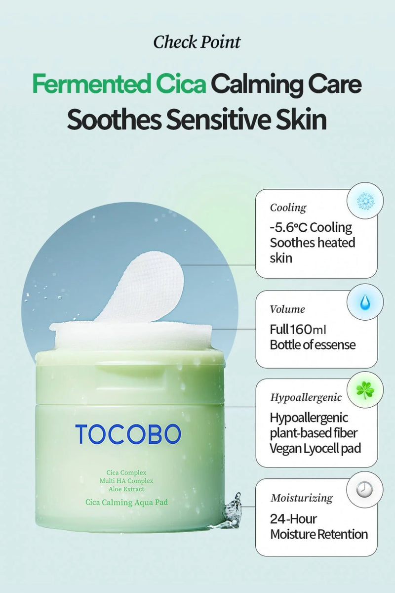 HOW IT WORKS Cica Calming Aqua Pads deliver soothing hydration and gentle calming effects in one easy step. These pads are saturated with a nutrient-rich essence that cools and comforts irritated or sensitive skin while lightly exfoliating to remove impurities and dead skin cells.